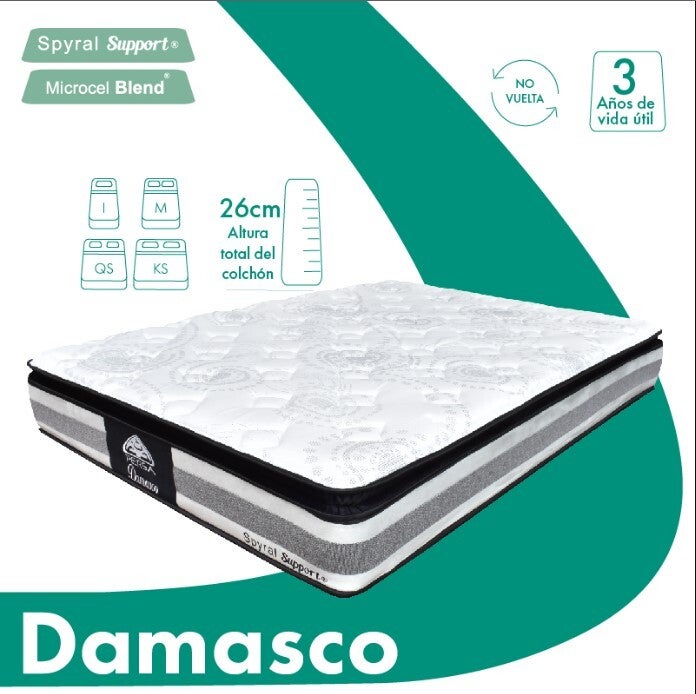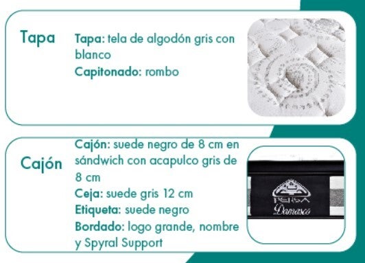 Colchón fabricado con la tecnología Spyral Support y en combinación con microcel que otorgan mayor durabilidad, confort y resistencia. Su tapa está hecha con tela de algodón color gris con blanco y capitonado en forma de rombo se añade una etiqueta en suede color negro. Cajón hecho con suede color negro de 8 cm en sándwich con acapulco gris de 8 cm. Se borda nombre, logo y tecnología.