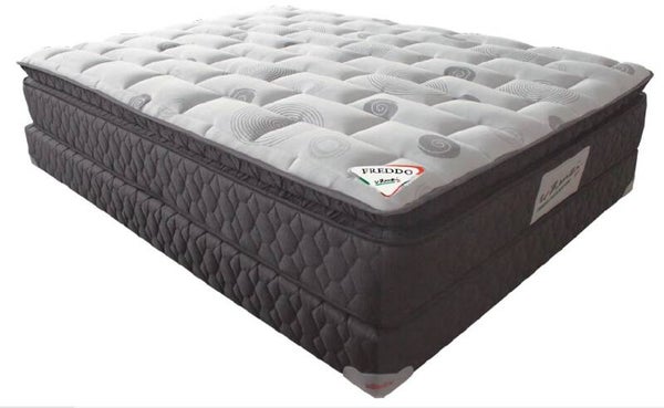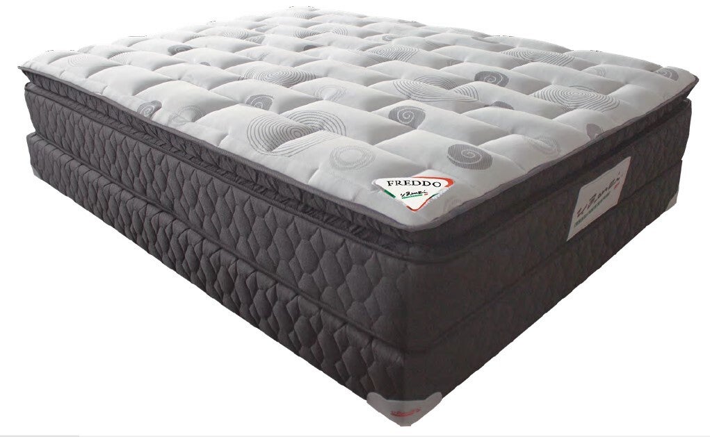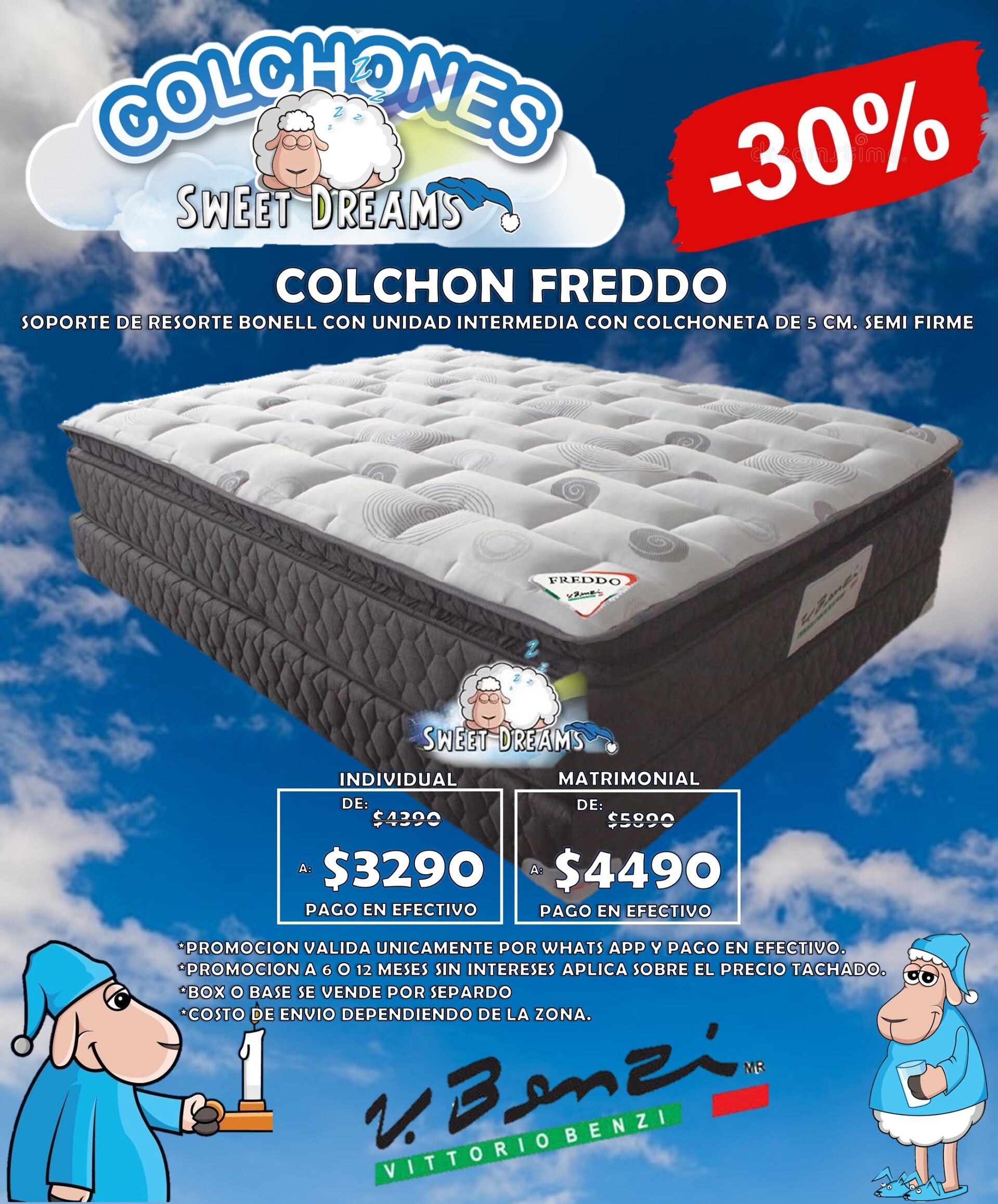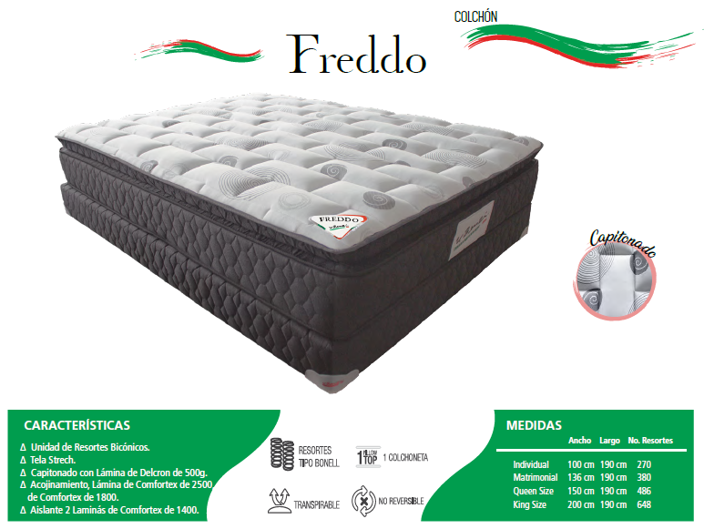 Colchón Freddo, cuenta con una unidad intermedia de resortes (IND 280 y mat 380), una colchoneta Semi firme de 8 cm y tela de algodón.