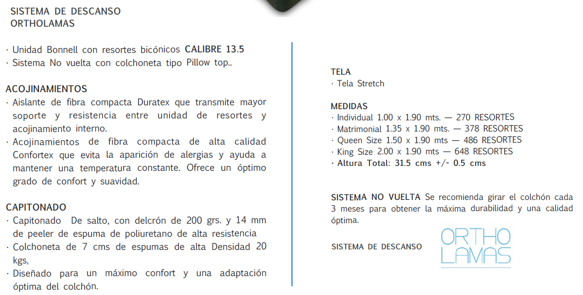 • Sistema No vuelta con colchoneta tipo Pillow top.